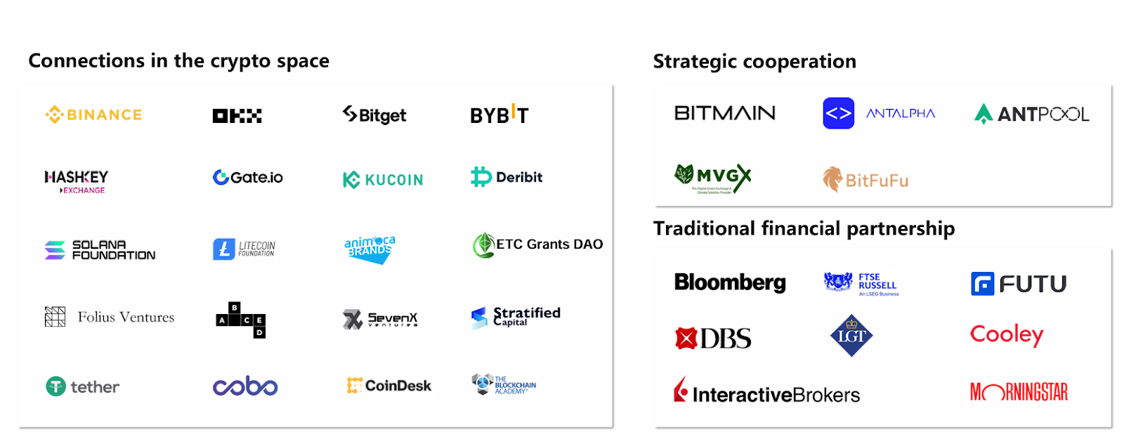 Other notable partners include Bloomberg, CoinDesk, Tether, Bloomberg, Morningstar, and Interactive Brokers Group